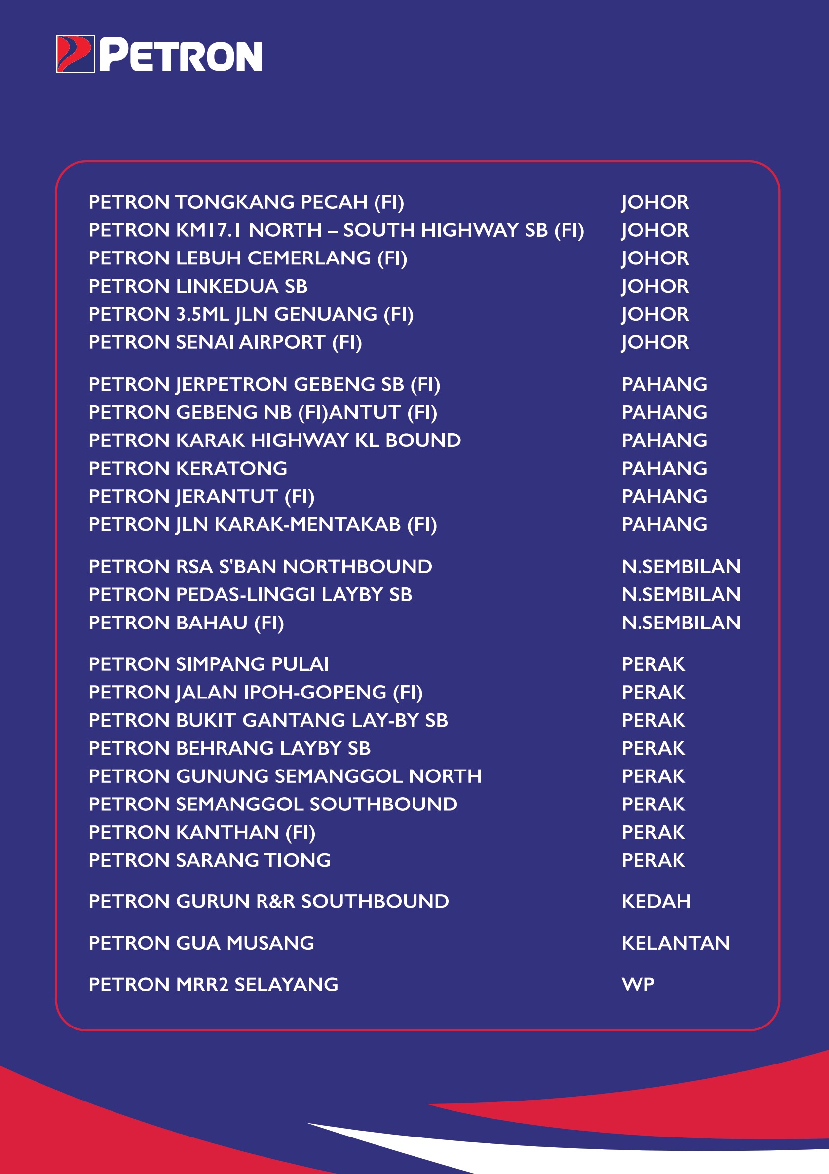 Petron Fleet Card helps you manage your fleet with flexibility and added security. Our network of about 800 stations in Malaysia are ready to serve you at all times.